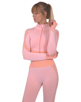 The high-collared zip-up Trois Seamless Sports Jacket is unique within our collection as it features two different fabric designs! The colorful pink and orange striped design alternates with pure pink ruched/stippled fabric areas, which gives this crop-top jacket style and sophistication combined with practicality of the highest level.